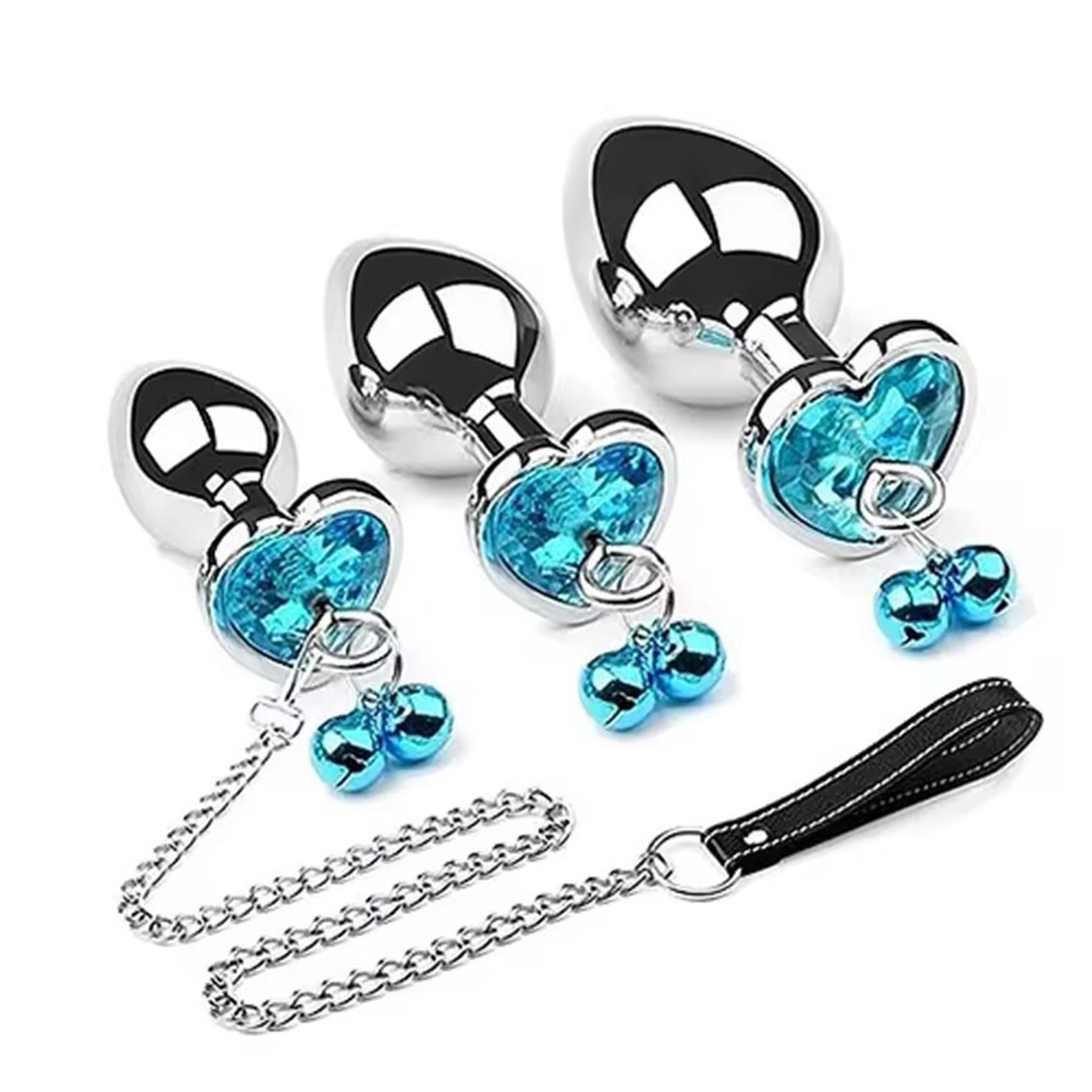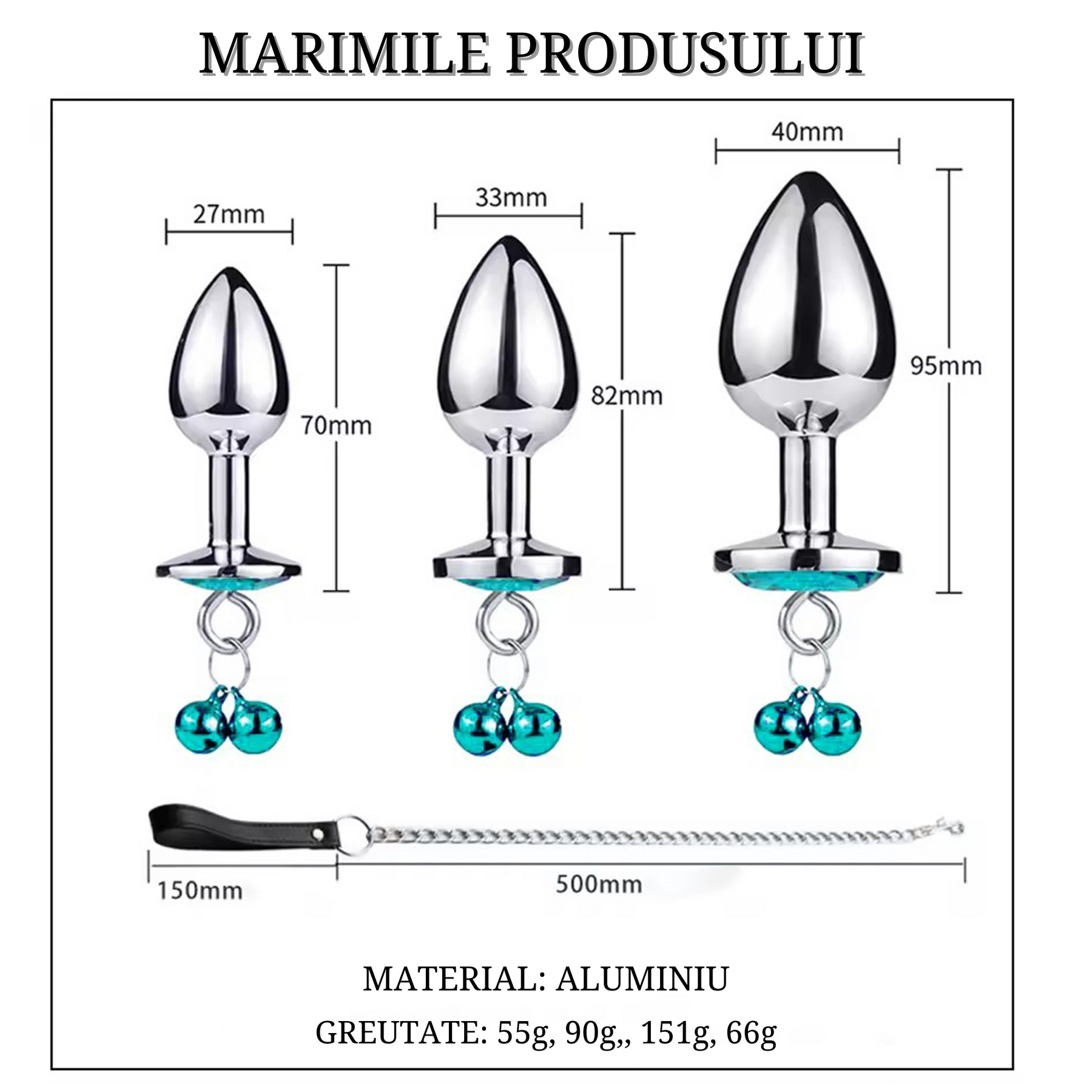 Set dop anal si lesa este un accesoriu premium conceput pentru cei care vor sa combine estetica rafinata cu functionalitatea si controlul. Realizat din otel inoxidabil si piele, acest set se remarca prin finisajul lucios, detalii decorative si o constructie solida, gandita pentru stabilitate si confort. Varianta albastra, cu lungime 70 mm si diametru 27 mm, este o optiune echilibrata ca dimensiune, potrivita pentru cei care prefera un accesoriu mai compact, dar ferm si bine definit. Cristalul albastru si clopoteii adauga un plus de stil si un element jucaus, fara sa compromita siguranta.