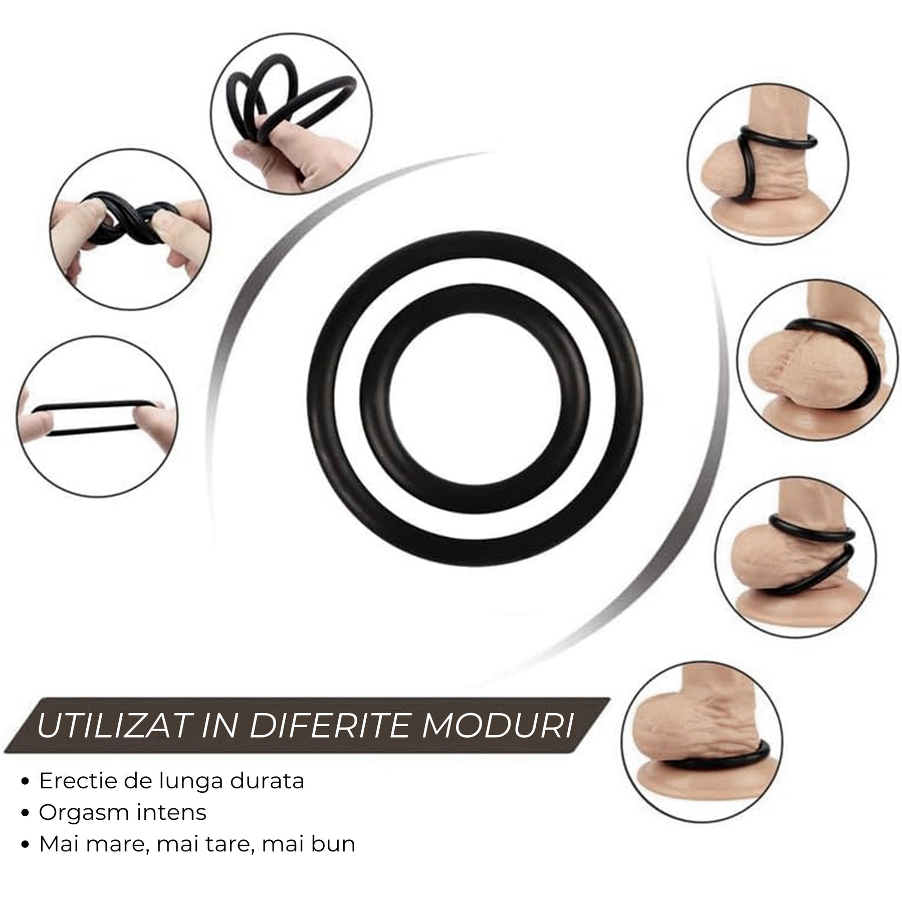 Fiecare inel poate fi utilizat individual sau in combinatie, atat la baza penisului, cat si in jurul testiculelor, pentru a crea senzatii variate si personalizate.