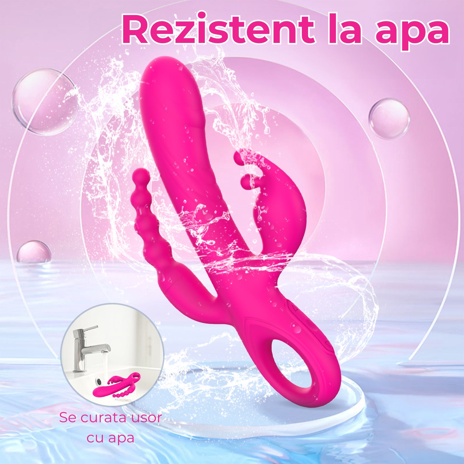 Motorul silentios ajuta la discretie, iar incarcarea USB este practica, fara baterii. Fiind rezistent la apa, acest vibrator triplu poate fi folosit si in dus sau cada, iar curatarea este simpla. Dupa utilizare, spala cu apa calduta si sapun bland sau cu o solutie dedicata jucariilor intime, clateste bine si usuca complet inainte de depozitare.